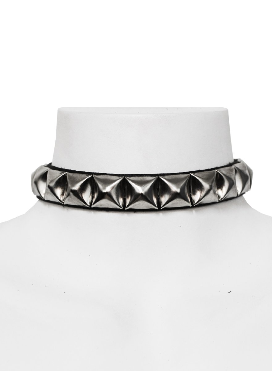 Halsbandet är svart och pryds av pyramid nitar. Justerbar storlek.