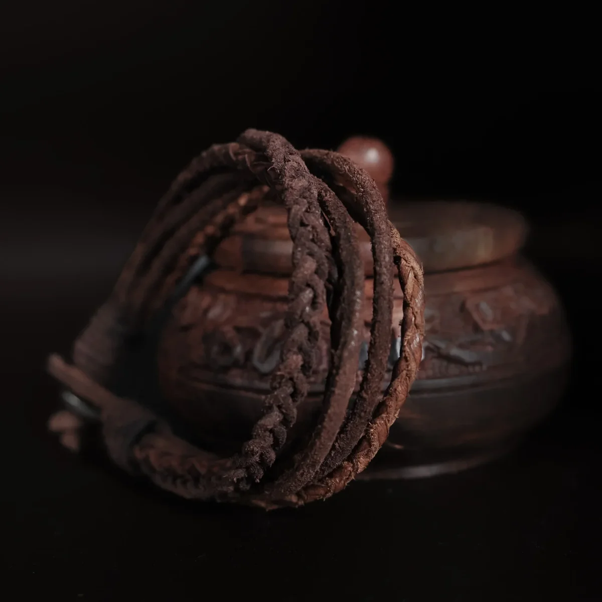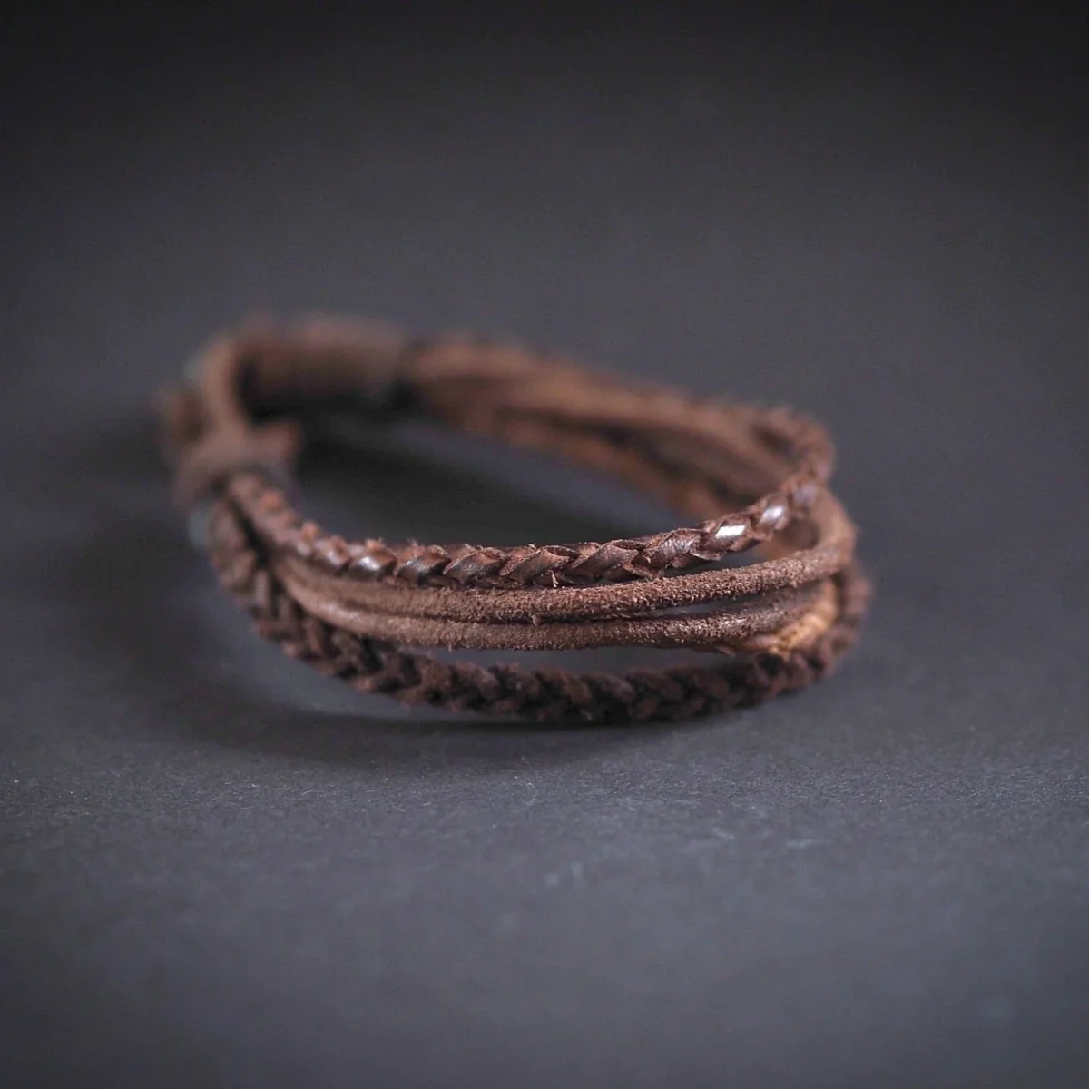 Det här armbandet är sammansatt av flera flätade och enkla läderband i ljusare och mörkare brunt läder. Vilket ger en simpel och stilren design. Stängningen är enkel med en ögla och en metallknapp.