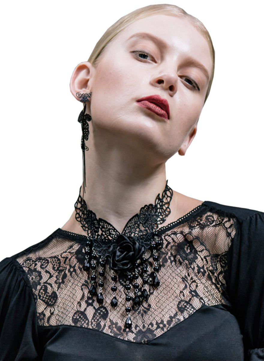Halsbandet är svart och pryds av svart ros och hängande svarta pärlor. Justerbar storlek.