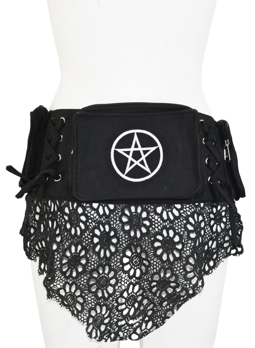 Cosmic Warrior Hip Belt Bag är en riktigt cool, midjeväska från Restless’N’ Wild. Tillverkad i ett starkt twill tyg, med 5 fickor, brodyr av ett pentagram och två månar samt blommig spets gör den sig oemotståndlig i den gotiska garderoben!