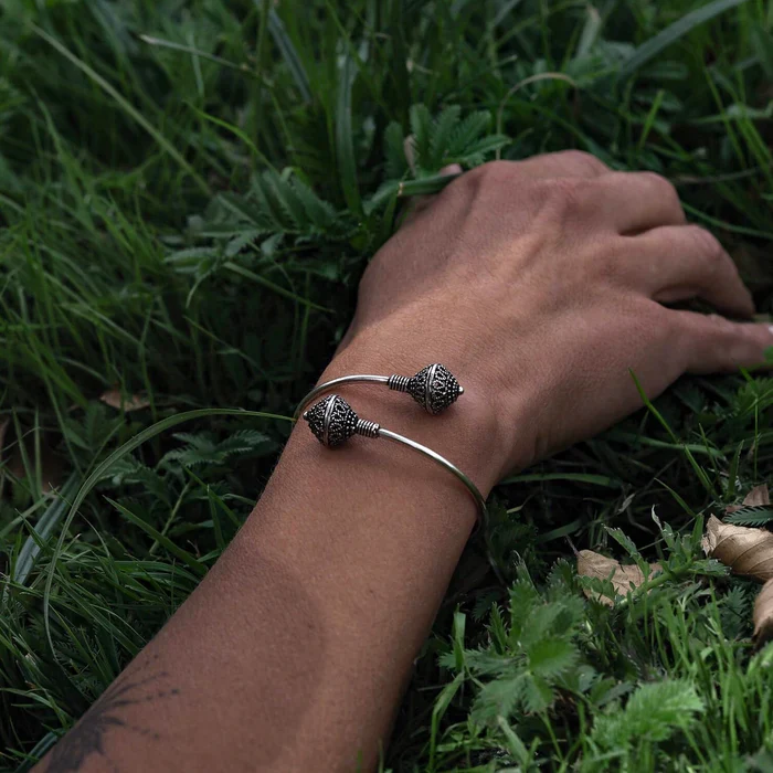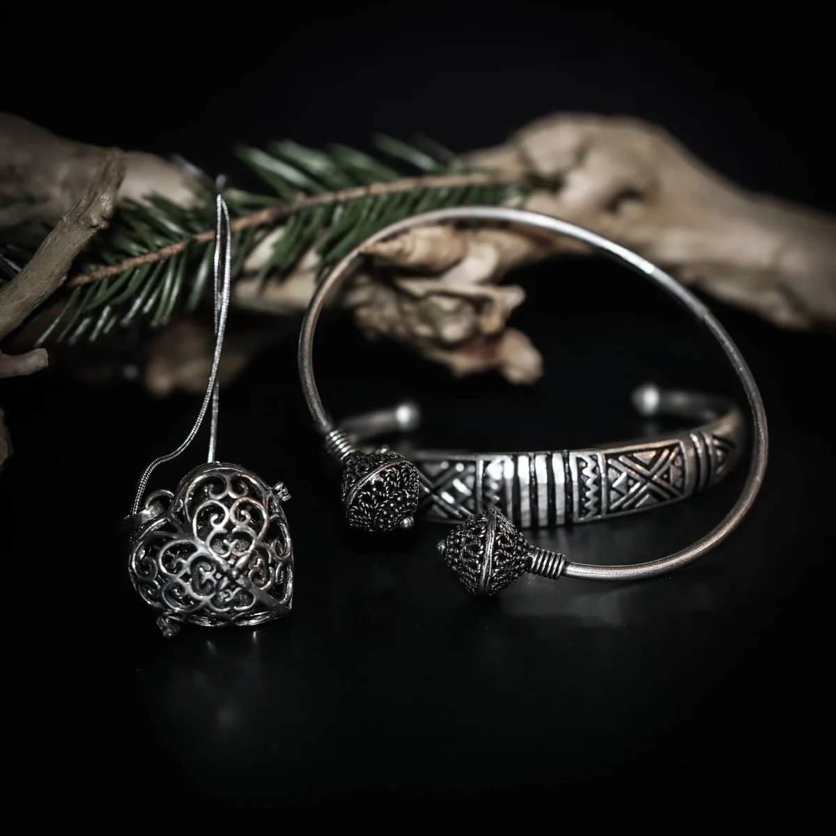 Ett vackert set till din kära med två vikinginspirerade armband och en änglaklocka i form av en hjärtformat berlock med en pingla i. Silverbelagd mässing, nickelfritt.