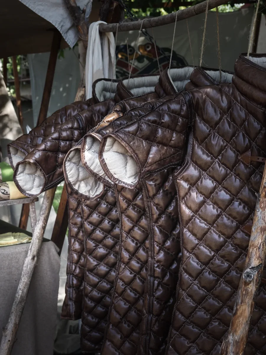 En solid fightingjacka till användning i blankvapen fighting, western style eller eastern style. Kan såklart även användas vid live roleplay/LARP eller SCA. Jackan är sytt i läder, fodrat med linne. Paddingen är gjord av återvunnet linnefiber. Storlekarna är lite små.