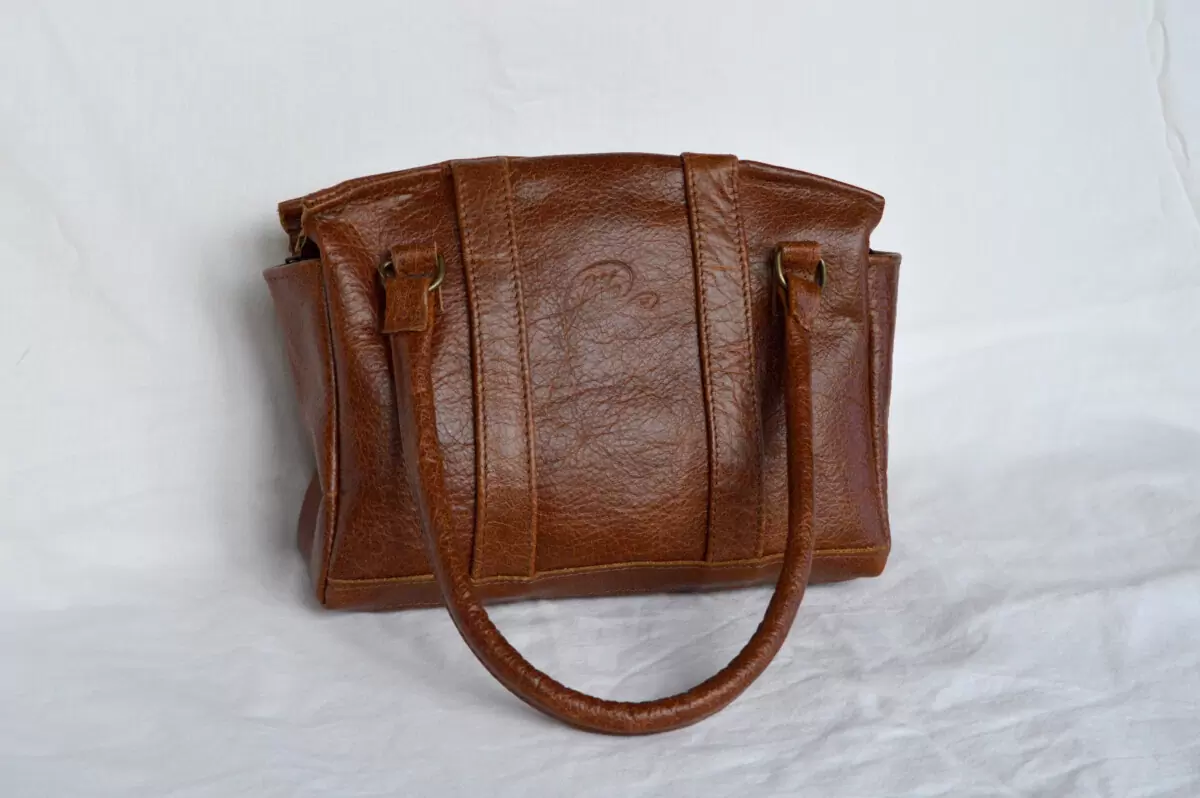 Handväska med stor invändig ficka tillverkad i lite kraftigare skinn ca 1mm som är mycket slitstarkt. Modellen är av egen design och tillverkning.