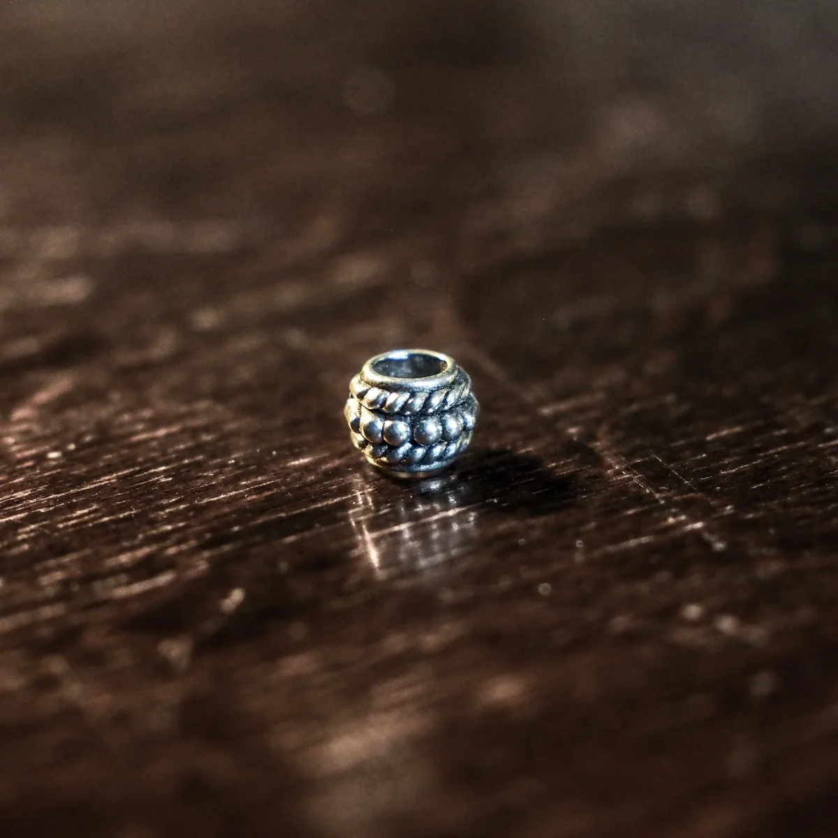 En liten pärla i silverpläterad mässing. Perfekt till att ha mellan större glaspärlor i en pärlrad eller på ett halsband. Passar även fint att ha i tunt skägg eller på tunna flätor i håret.