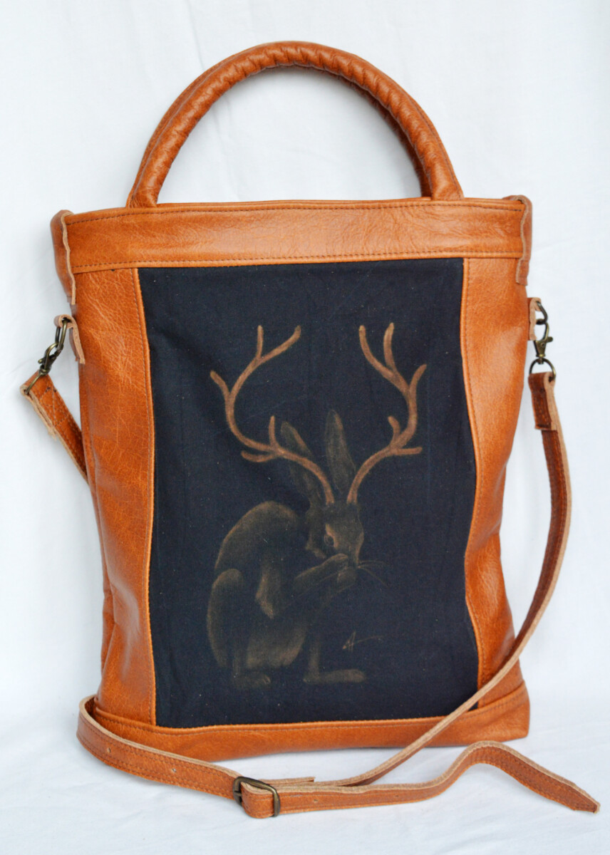 ”Mythical Hare” är ett samarbete med konstnären ”theshymush” där varje väska blir unik och kommer endast att finnas i ett exemplar. Invändigt finns en ficka även den med ett mindre arbete som matchar frontbilden.
